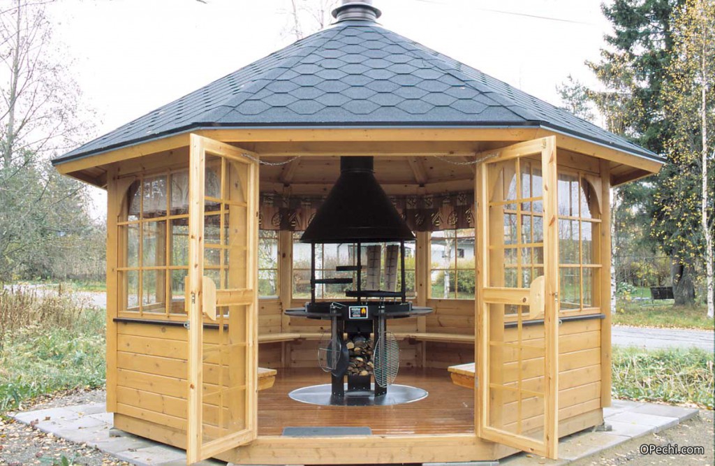 Grillovnen er bare egnet for utendørs lysthus, ligger i sentrum og inntar en del av plassen. En allment tilgjengelig metode, siden du kan lage en ovn selv. Det er lett å finne retter som tilberedes på grillen: den inkluderer kjøtt, fisk, grønnsaker. En peis er et anerkjent element av komfort. Det trengs for å skape en vennlige omgivelser inne i rommet og helårsvarme. Det er innglassede kombinert arbors med grill og komfyr.