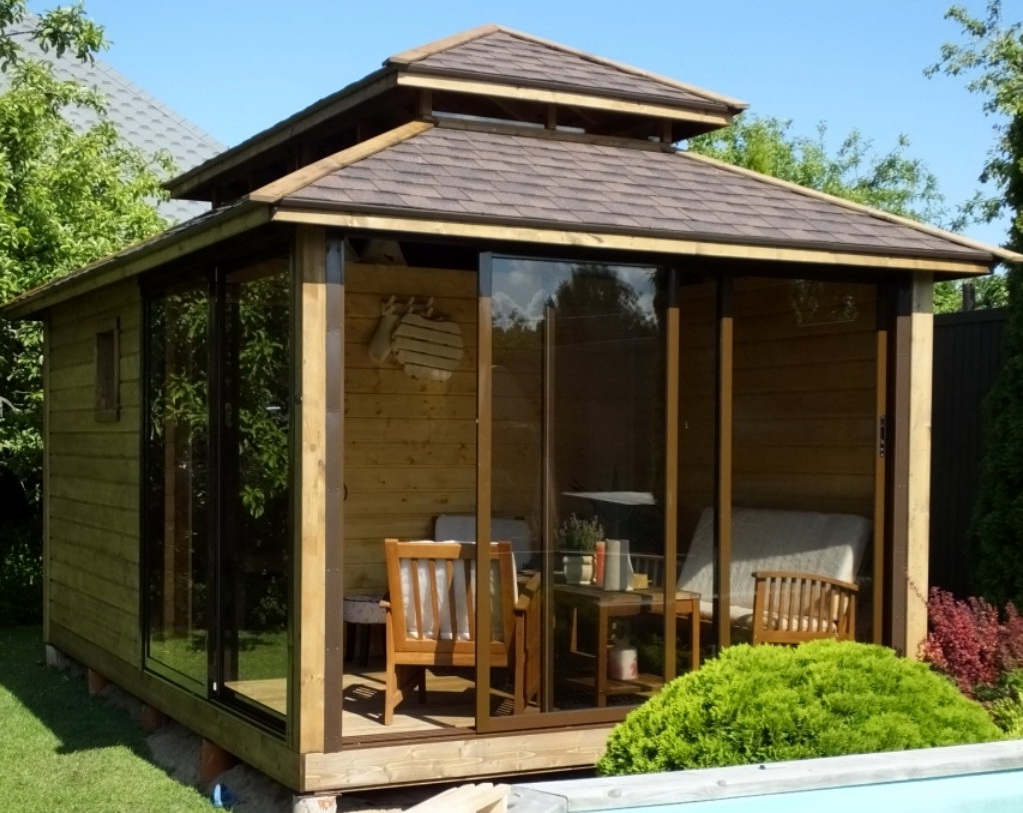 Glaserte lysthus til sommerhus - dette er en liten bygning som trenger plassering. Du bør starte med valg av form: rund, polygonal, firkantet eller rektangulær. Basert på det ferdige fundamentet og det foreslåtte området, kan du ordne det indre rommet til rommet slik alle liker.