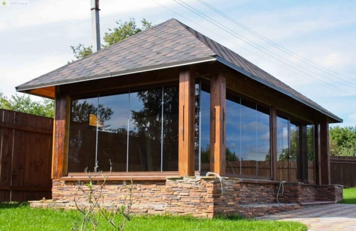 Rammeløs, eller ellers - rammeløs vindu, den kontroversielle metoden for innglassing av lysthusets lokaler. Fasaden fanger umiddelbart minimalisme og estetikk, men tilstedeværelsen av sømmer forårsaker et lavt tetthetsnivå. Derfor er penetrering av støv, snø eller annet naturlig avfall et spørsmål om tid. Denne utformingen av glass er mangfoldig: det kan flyttes fra hverandre / brettes ved hjelp av et reguleringssystem installert inne i en glasert arbor.